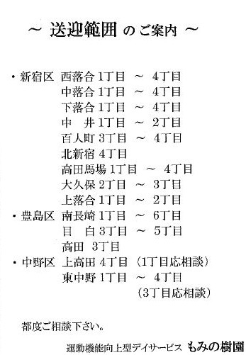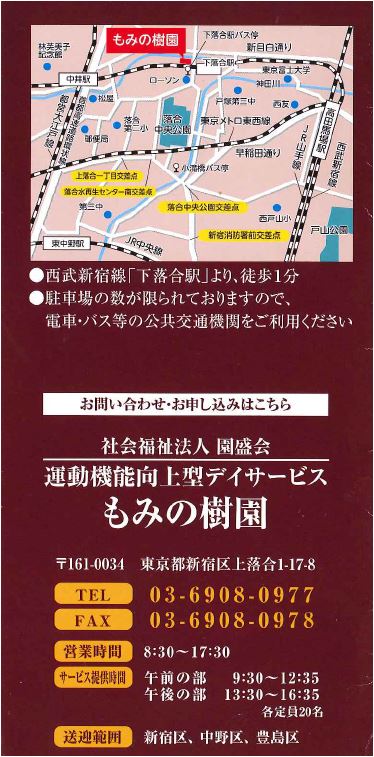 あなたの介護・リハビリ ライフ応援します。2017年8月1日より新規開設しました( もみの樹園内 1 階 )「新宿区 西落合」の皆様、新規入所募集中です。スタッフ一同 心よりデイサービス新設のご案内「 特別養護老人ホーム もみの樹園 」開設しました。 あなたの ... |
